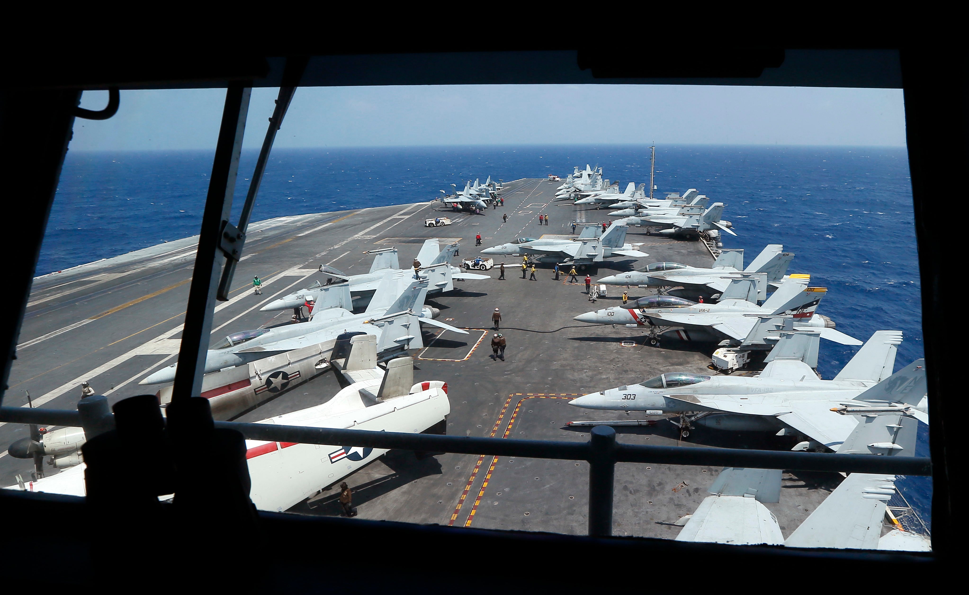 A row of U.S. Navy F18 fighter jets as they are prepared for a routine patrol from the U.S. Navy aircraft carrier USS Carl Vinson (CVN 70) off the disputed South China Sea Friday, March 3, 2017.