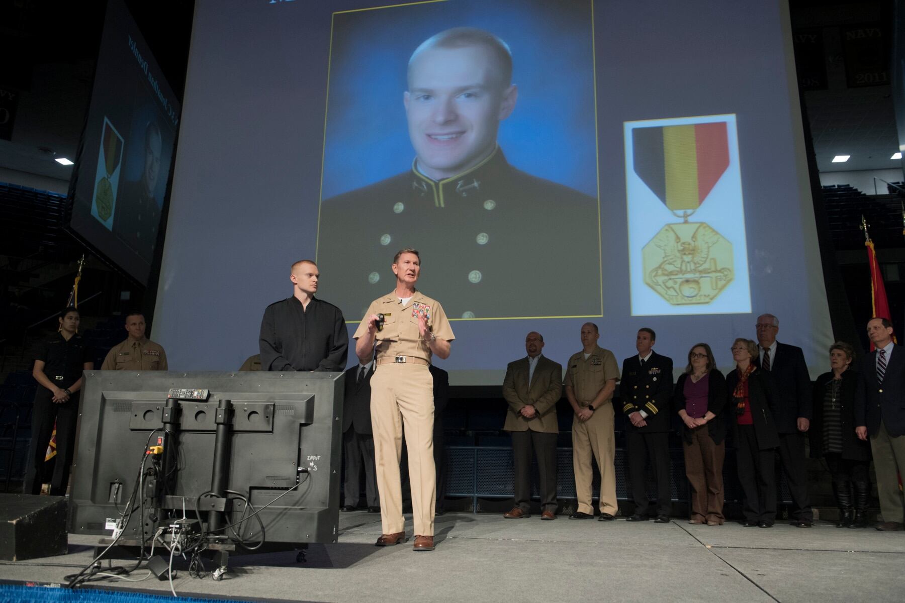 Braving a life-threatening storm to rescue stranded scouts, Naval Academy Midshipman 3rd Class Jonathan Dennler was awarded the Navy and Marine Corps Medal.
