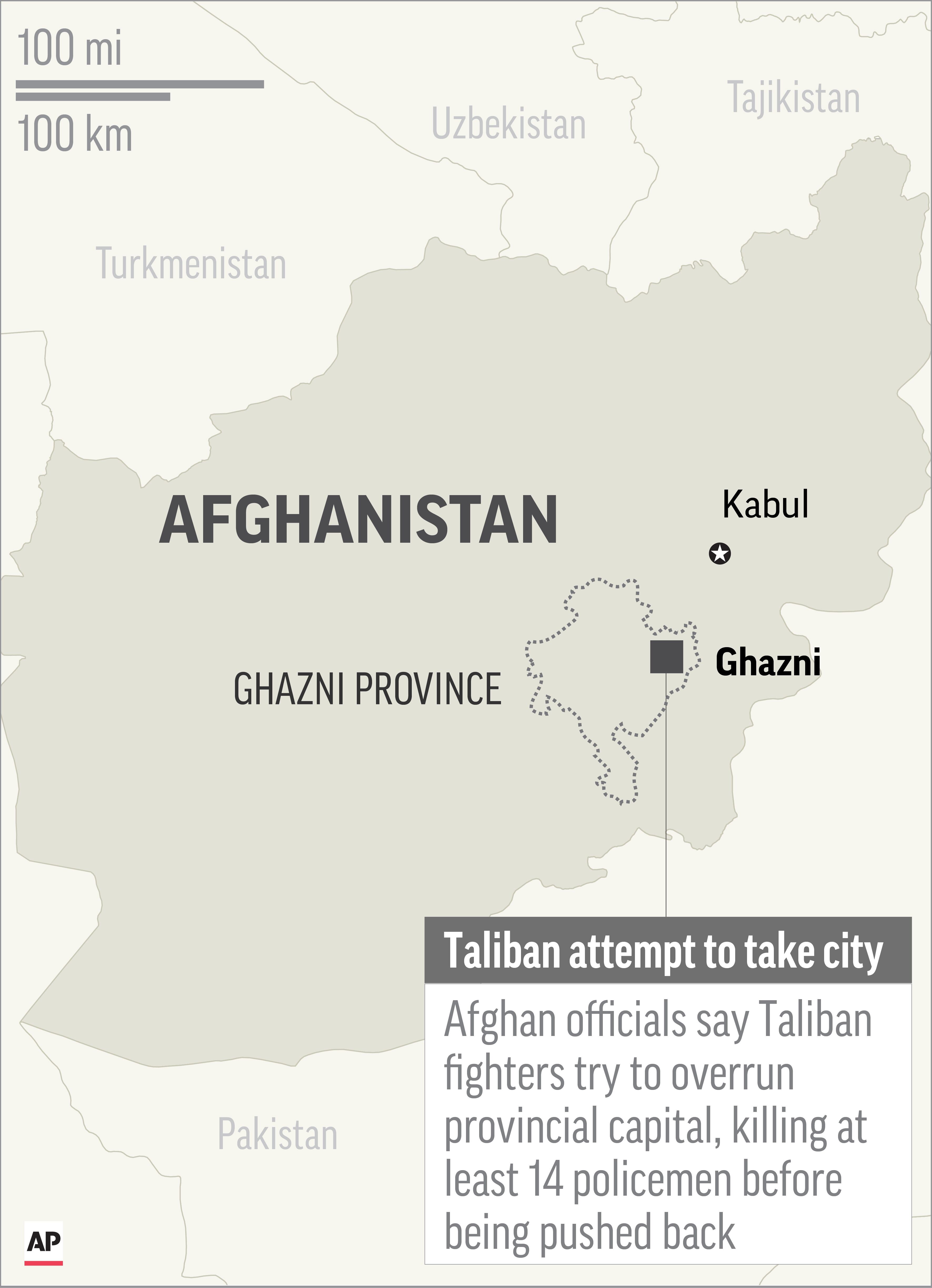 At least 14 Afghan policemen were killed and 20 were wounded in the assault on Ghazni, the capital of a province with the same name, provincial police chief Farid Ahmad Mashal told The Associated Press.