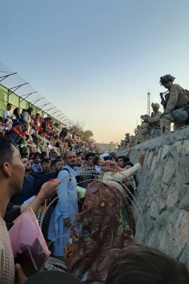 Once there, he joined thousands of Afghans packed into the last remaining entrance to the airfield, a narrow road surrounded by high walls and barbed wire. Down the middle, a sewage ditch swelled with desperate Afghans jostling for attention. The sun hammered the shadeless corridor. Armed Marines barked at the crowd to stand back.