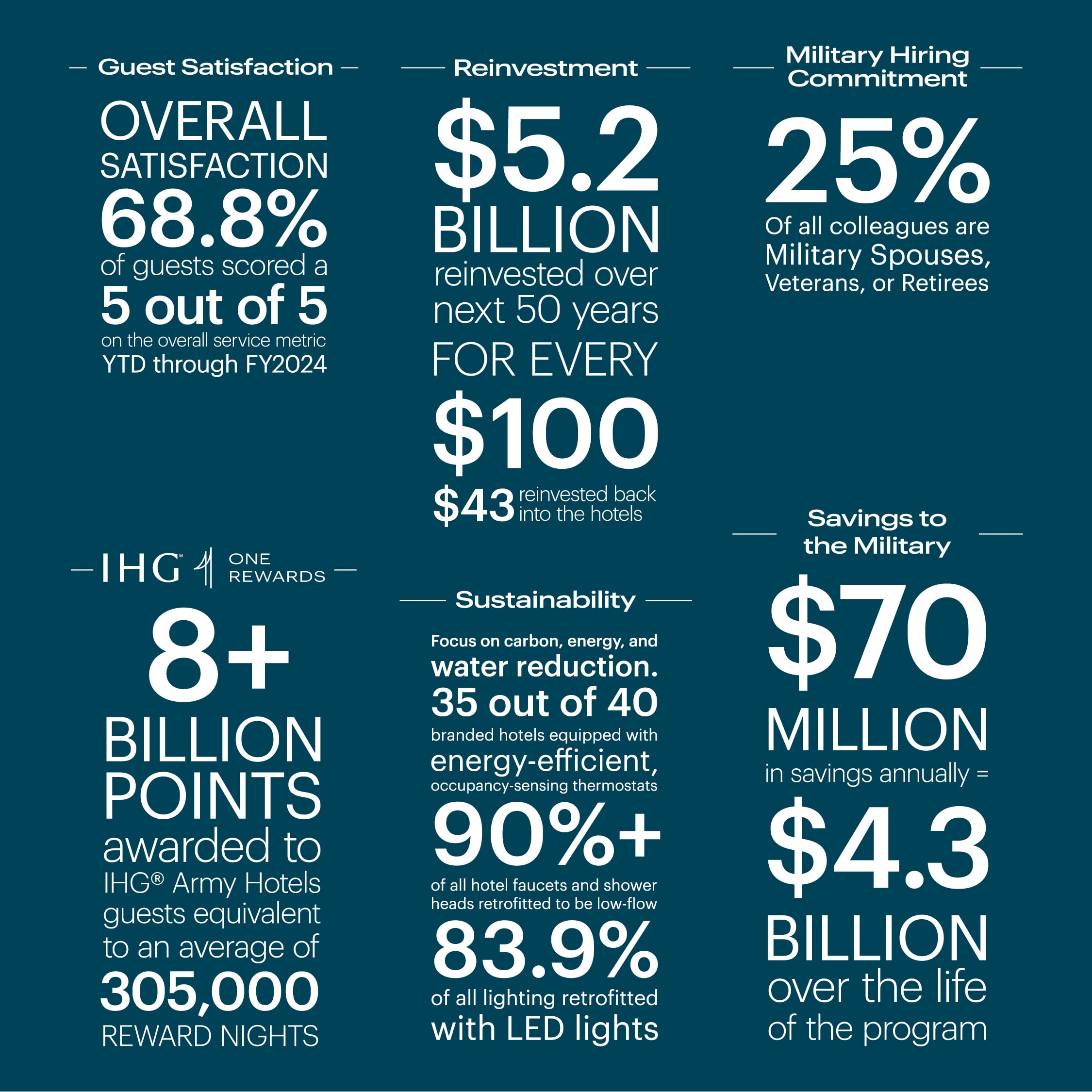 Privatization has also benefited the Army itself. Each year, the PAL program saves the Army $70 million, with more than $4 billion in savings over the life of the program. The program is self-sufficient; for every $100 we receive, $43 is reinvested into our hotels—with more than $5 billion to be reinvested over the next 50 years. This reinvestment is what makes it possible to continually renovate our hotels to reflect the strictest brand standards set by IHG, as well as to provide newly-constructed hotels at many locations, such as Candlewood Suites and Staybridge Suites hotels.