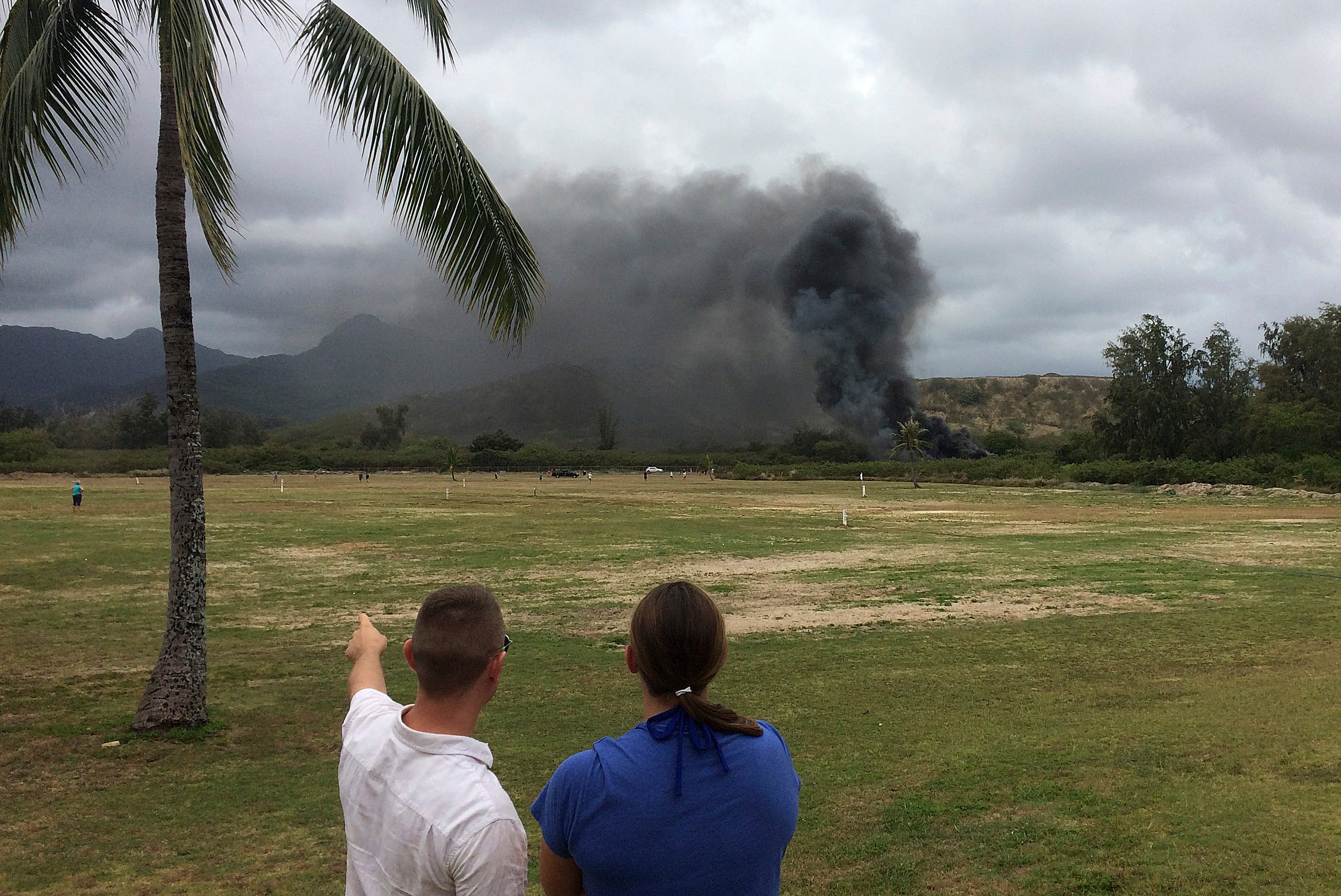 A man and woman look toward smoke rising from a Marine Corps Osprey aircraft on May 17 after making a hard landing on Bellows Air Force Station near Waimanalo, Hawaii. The fatal crash of the Marine Corps' new hybridized airplane-and-helicopter aircraft during a training exercise is renewing safety concerns about the machine.