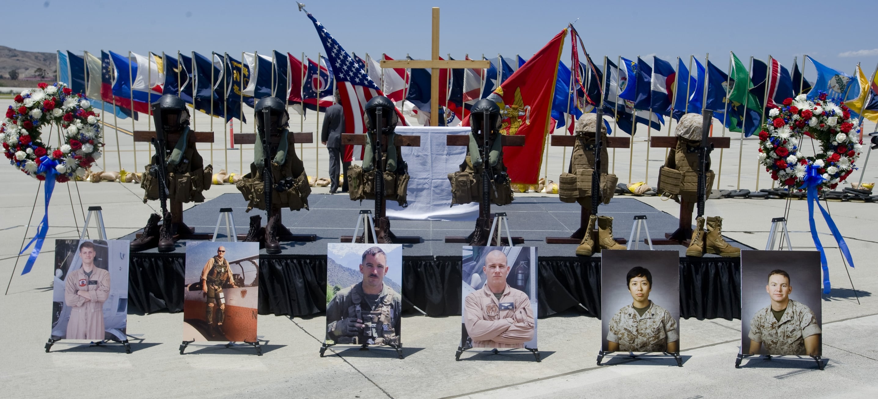 Photos of six Marines killed in a helicopter crash while on a rescue mission for earthquake victims in Nepal are displayed with flight vests, helmets, rifles and boots during a June 3 memorial service at Camp Pendleton, Calif. The six were, from left, Capt. Dustin R. Lukasiewicz, Capt. Christopher L. Norgren, Sgt. Ward M. Johnson IV, Sgt. Eric M. Seaman, Cpl. Sara A. Medina, and Lance Cpl. Jacob A. Hug.