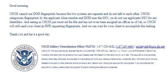 However, USCIS’ decision to no longer accept the DoD fingerprints may make it more difficult for service members to get naturalization paperwork in order. In correspondence obtained by the Military Times, USCIS said it is no longer accepting the DoD fingerprints.