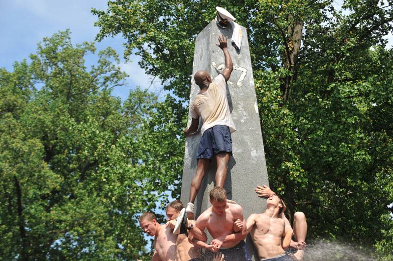 Each year, the roughly 1,000 members of the academy's plebe (freshman) class form a human pyramid to scale the grease-covered 21-foot tall obelisk.