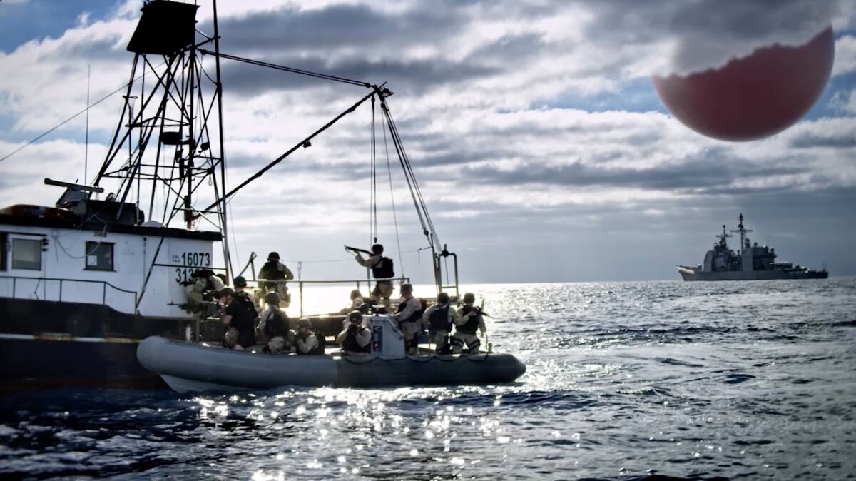 Another commercial, "Pin Map," which debuted Jan. 23 and featured huge red spheres in the air, over land and over oceans — later revealed as push pins in a world map showing the service's global presence — also ended with "America's Navy."