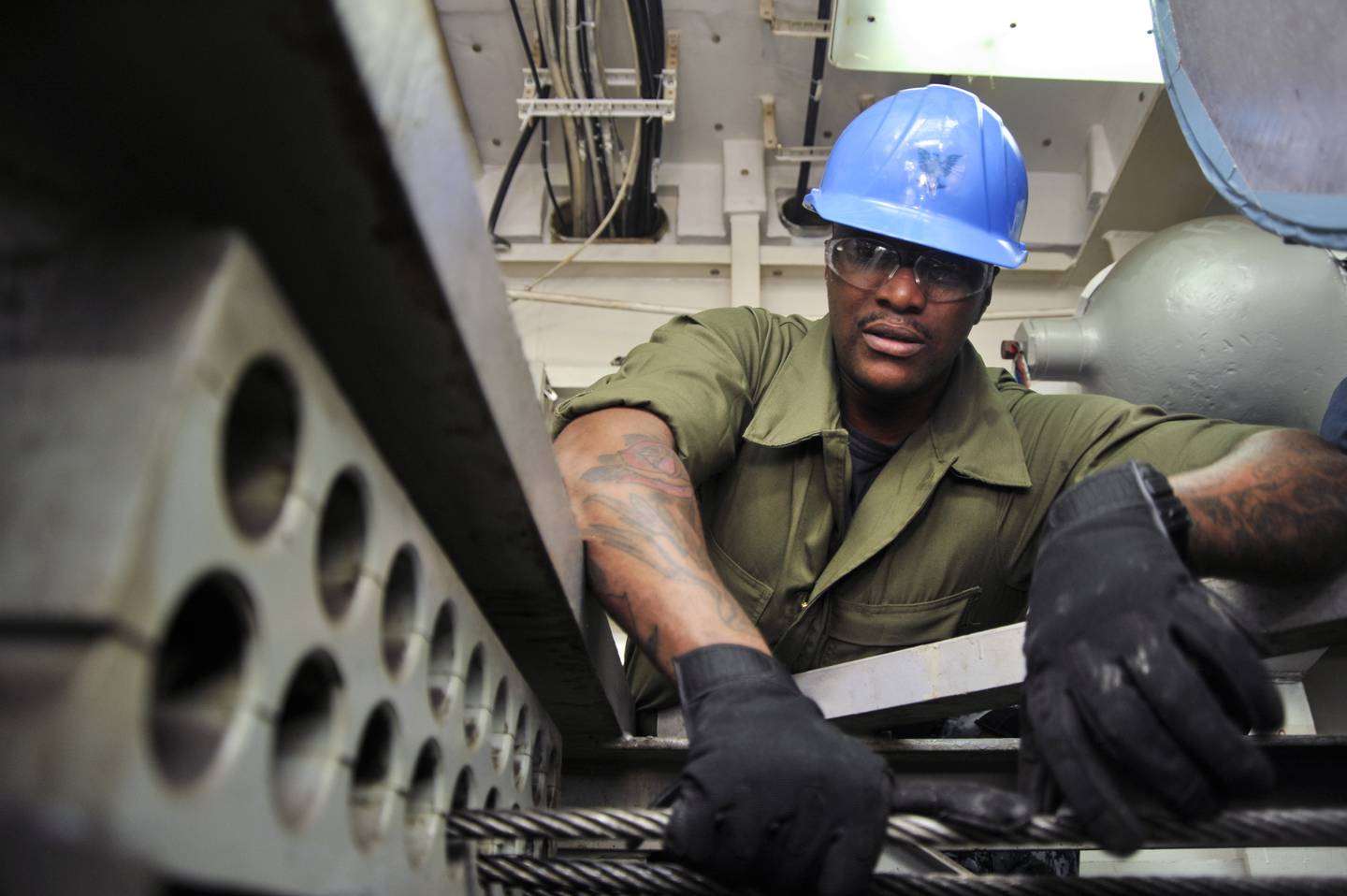 Tattoos are popular with sailors, especially millennials. New rules will allow more inked sailors to compete for career-enhancing jobs like recruiting duty. Here, Aviation Boatswain's Mate (Equipment) 3rd Class James Fisher participates in a cable reweaving in the engine room of carrier Abraham Lincoln.