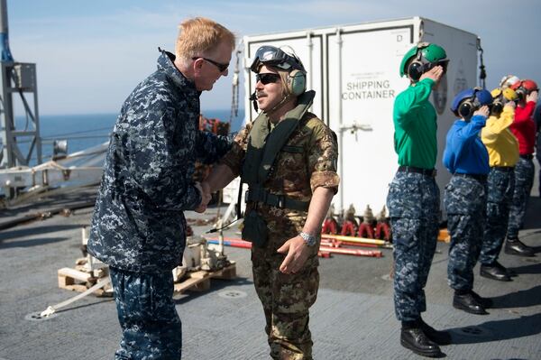 Sixth Fleet commander Adm. James Foggo greets Italian Gen. Salvatore Farina, commander of the NATO joint force, after landing aboard command ship Mount Whitney during BALTOPS 2016,