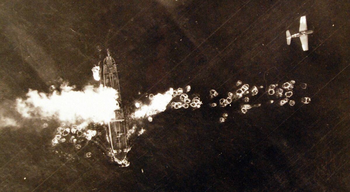 A Japanese destroyer escort threatened Harrison until carrier pilots’ rockets and machine-gun rounds drove it off.