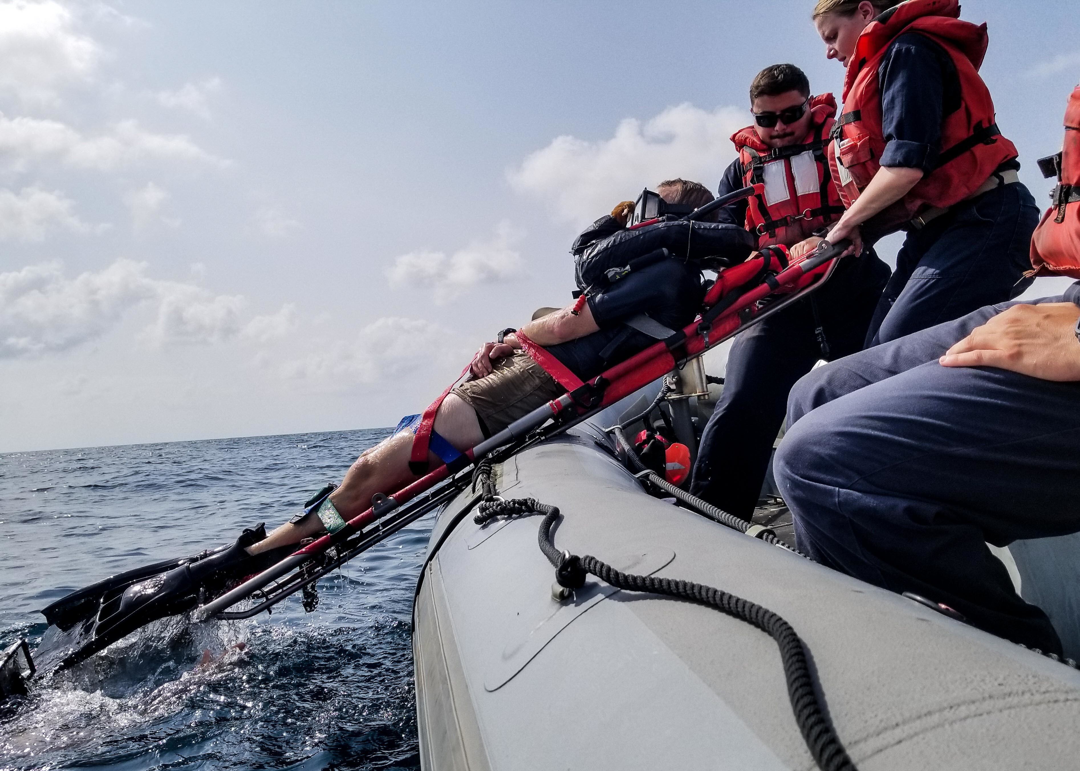 “Sun was shining, and seas were flat,” a search-and-rescue swimmer on board the RHIB that day recalled. “We were having a good time…we were happy to be off the ship for the first time in a little while.”