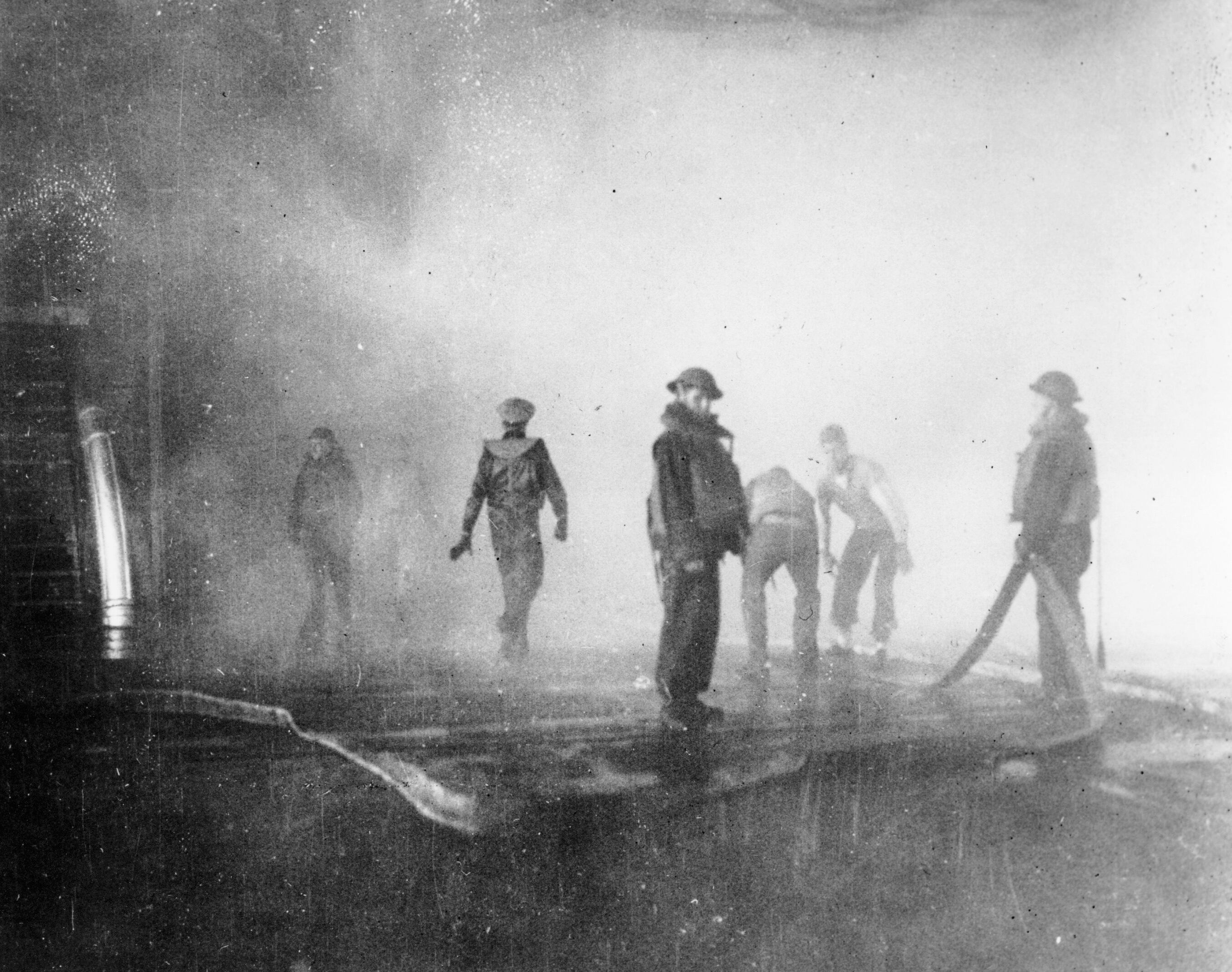 Japanese dive bombers left the Yorktown badly damaged, with black smoke gushing from its stacks, but the vessel was still upright.