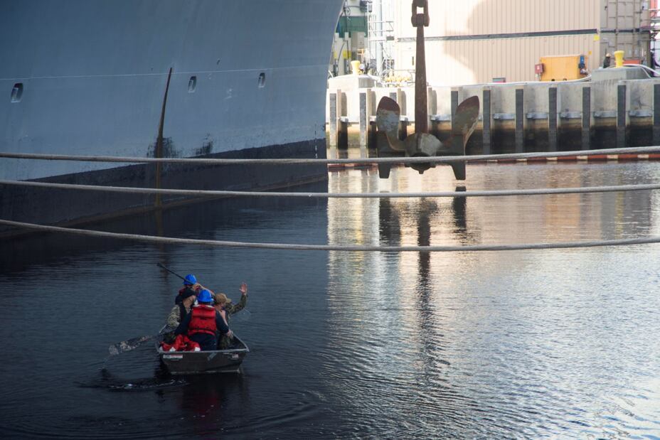The duo took a little dinghy out to the anchor of the Truman, which is currently in the Norfolk Naval Shipyard for its extended carrier incremental availability period, according to officials.