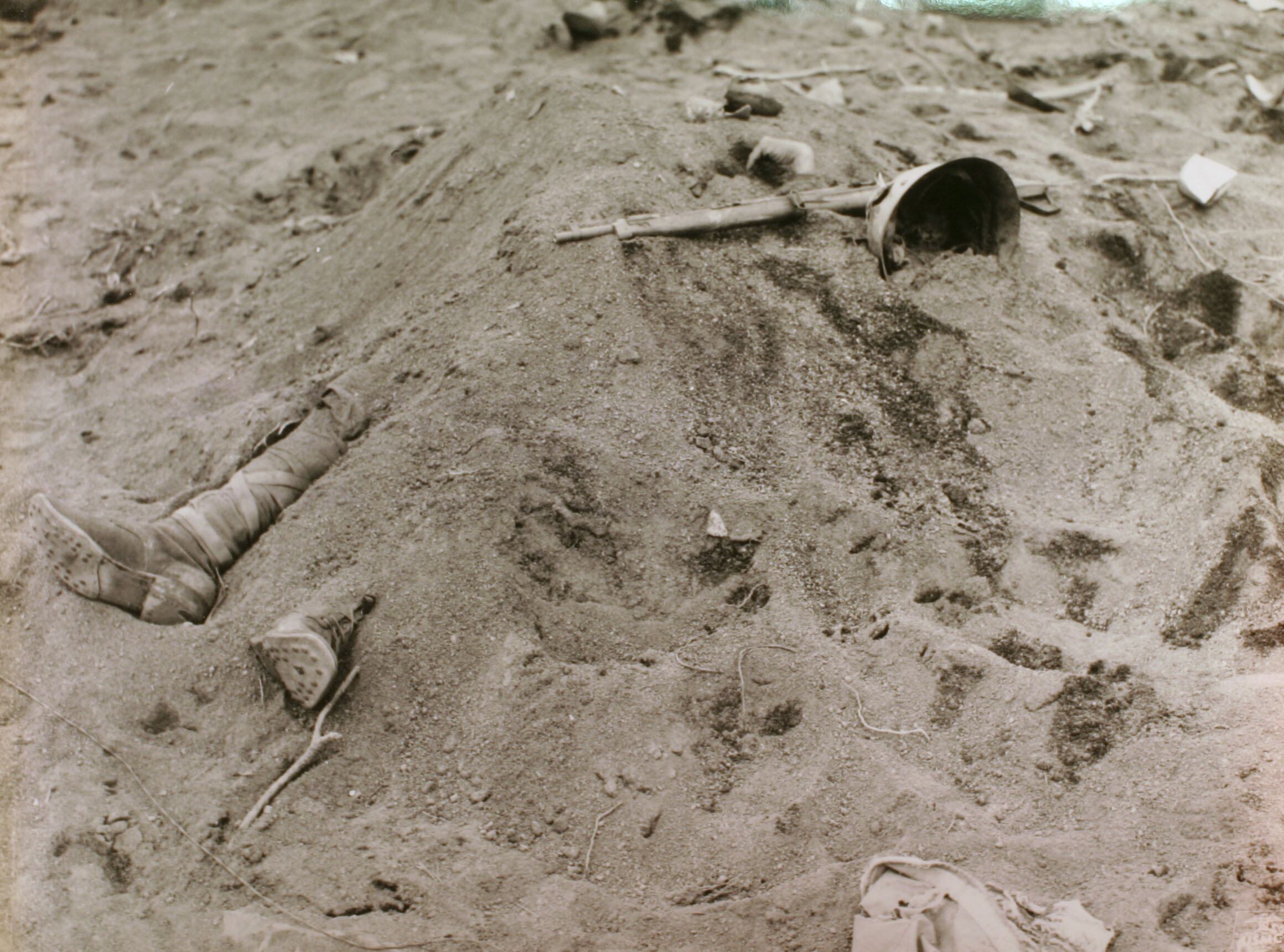 Marines who landed on the beaches of Iwo Jima were weighted down. Each man carried two heavy bandoliers of ammunition around their necks, grenades in their pockets, two canteens on their hips, a bedroll attached to their backs, and of course, their rifles. With only one free hand, digging through Iwo Jima’s soft, black sand proved to be an excruciating ordeal.