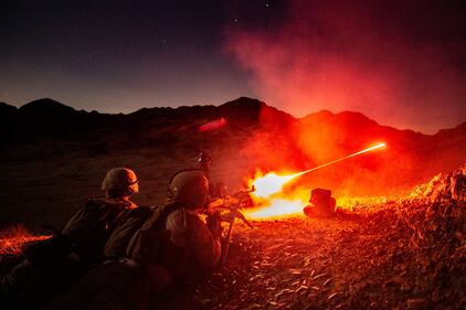 Members of the 24th Marine Expeditionary Unit provide combat support with an M240B medium machine gun while conducting night live-fire platoon assault training at Camp Titin, Jordan, June 21. (1st Lt. Mark Andries/Marine Corps)