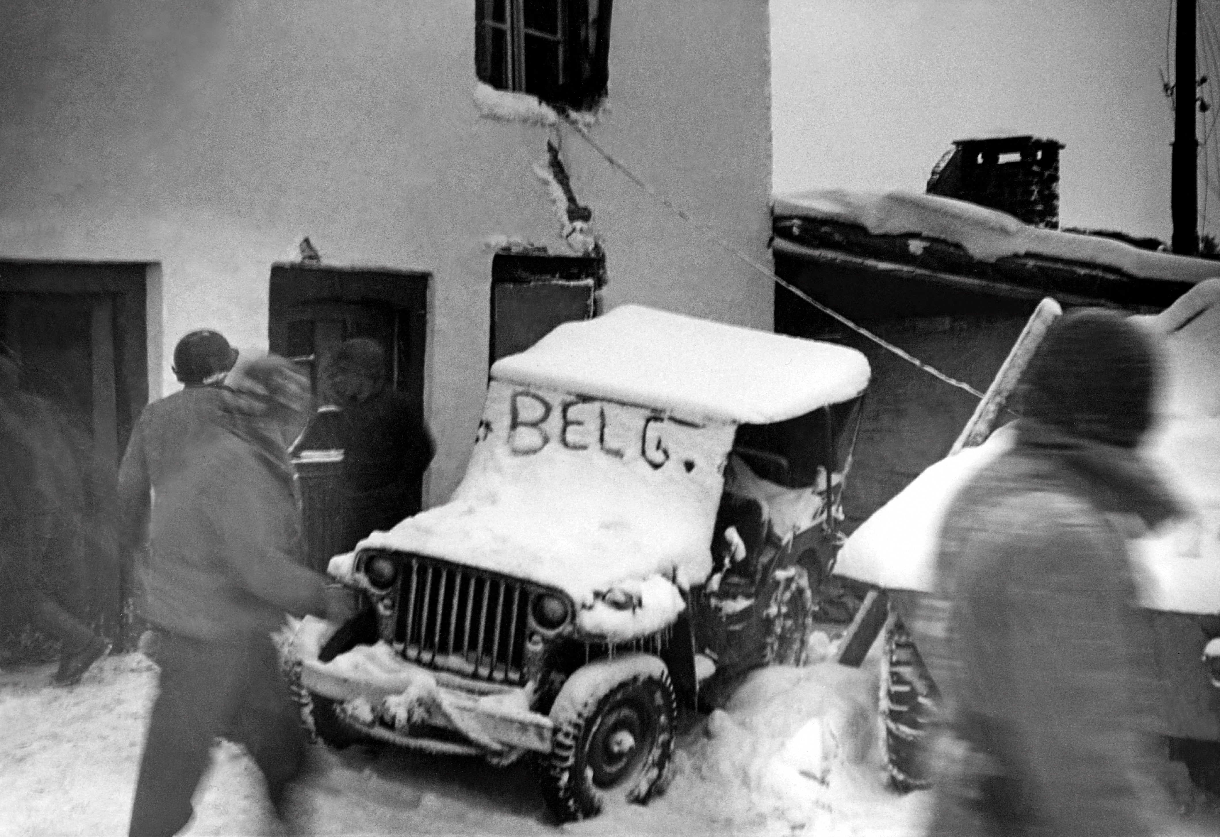 On the fringes of the Battle of the Bulge, a snow-covered jeep can be seen with the word 'Belg' on its windshield. (Tony Vaccaro/Getty Images)