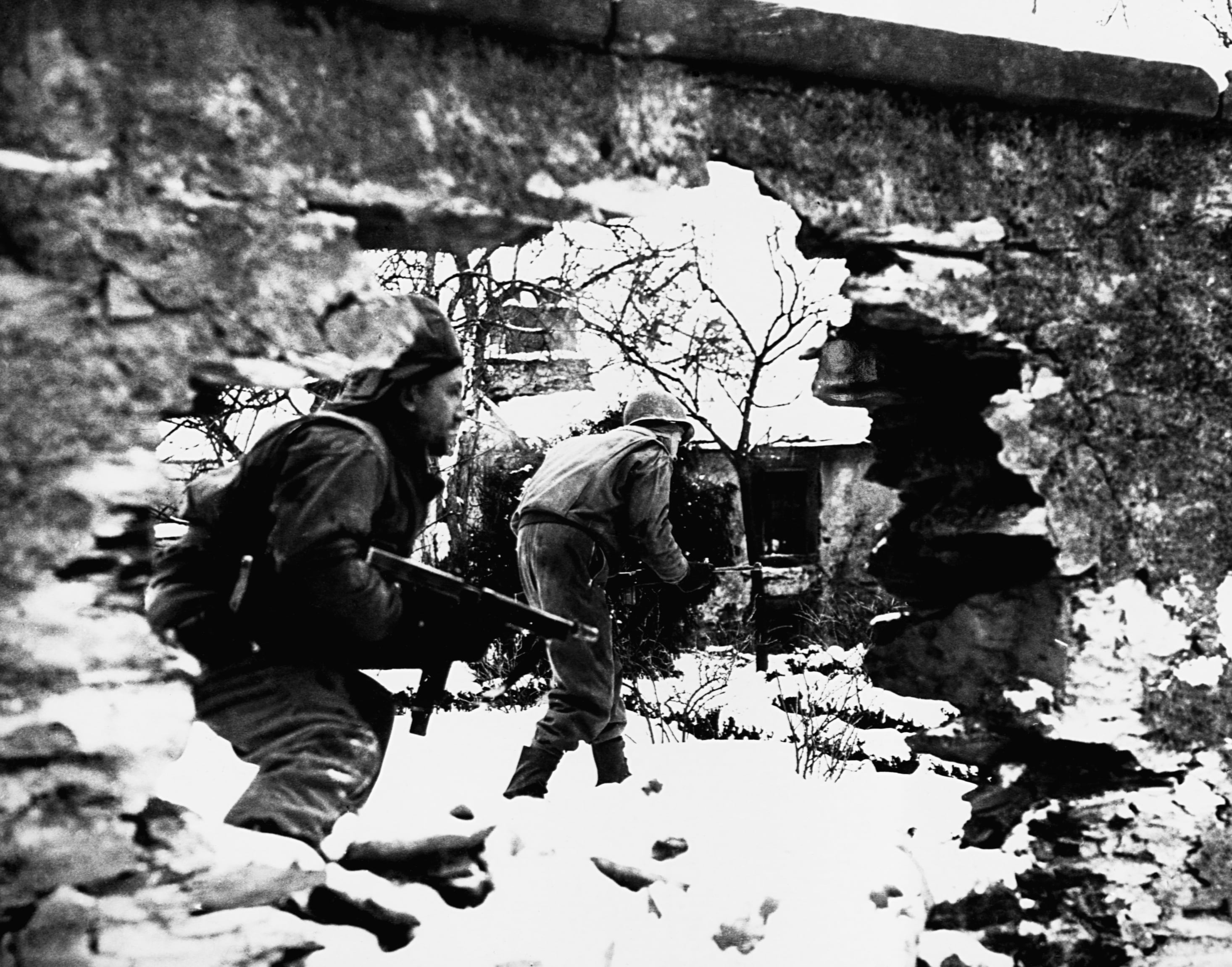 Soldiers move stealthily through the snow during the Battle of the Bulge. (Corbis/Getty Images)
